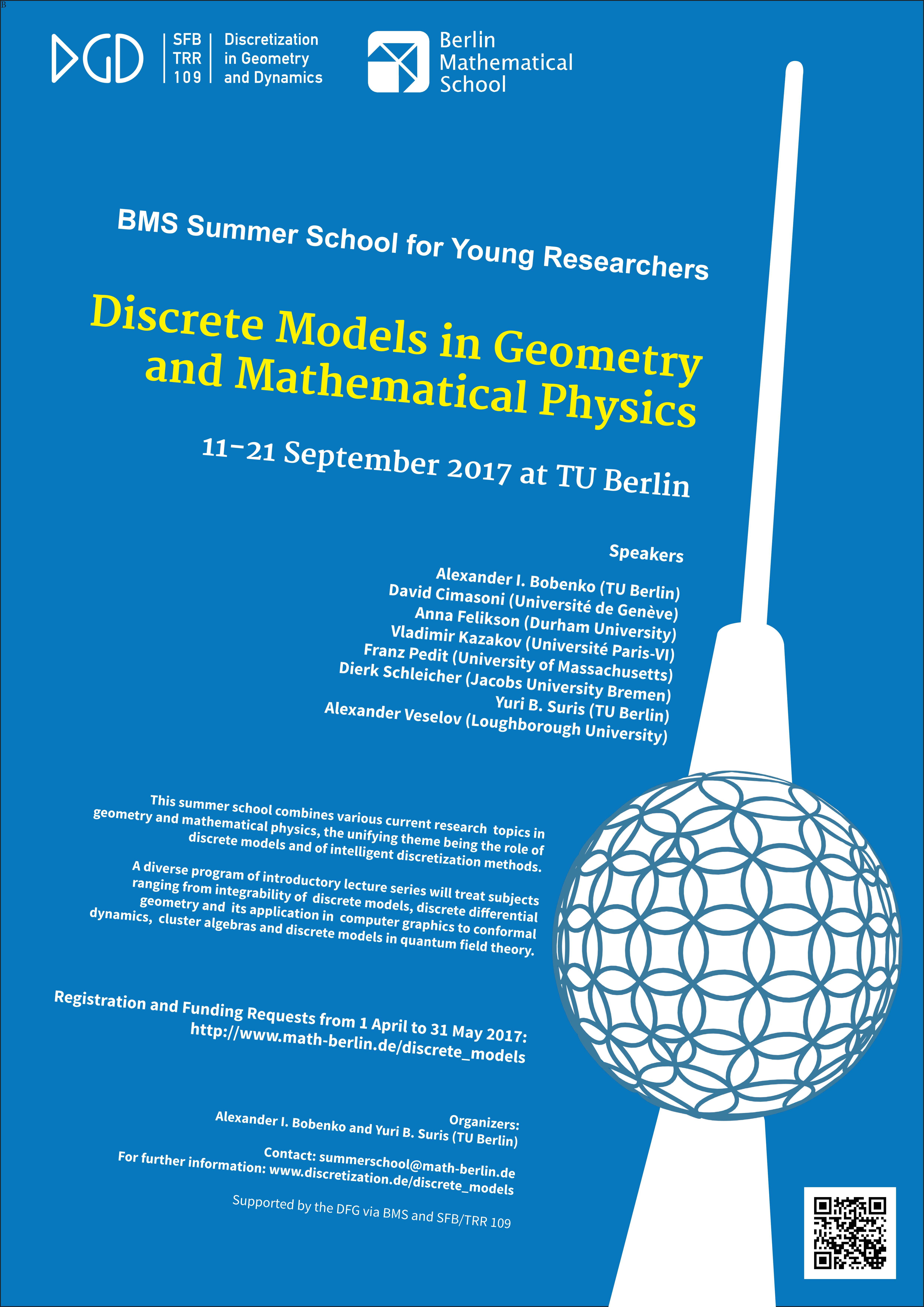 This summer school combines various current research topics in geometry and mathematical physics, the unifying theme being the role of discrete models and of intelligent discretization methods. It is organized by the Berlin Mathematical School and the SFB/TRR 109, Alexander Bobenko and Yuri Suris.